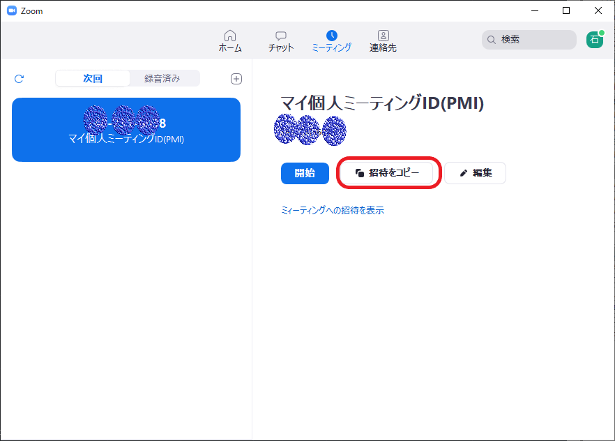 ④ ②ミーティングIDと③パスワード これをミーティング参加者に教えてあげます。